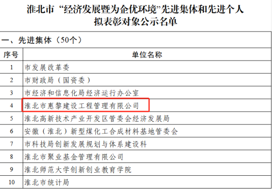 淮北市惠黎建設(shè)工程管理有限公司榮獲淮北市“經(jīng)濟(jì)發(fā)展暨為企優(yōu)環(huán)境”先進(jìn)集體稱號