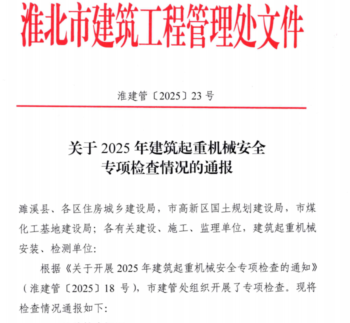 2025年7月21日,淮北市建筑工程管理處發(fā)布了2025年建筑起重機(jī)械安全專項(xiàng)檢查情況通報(bào),淮海建工公司承建的悅溪杏林小區(qū)、狀元府兩個(gè)項(xiàng)目在安全管理制度健全、安全生產(chǎn)措施落實(shí)及建筑起重機(jī)械安全狀況良好等方面表現(xiàn)突出,獲得市建管處通報(bào)表?yè)P(yáng)的同時(shí)也為公司贏得了信用加分!