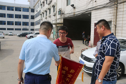2018年6月19日10時,淮北市保安有限公司派駐淮北車管所人防一中隊隊員房德寶在大廳巡邏執(zhí)勤時拾到一錢包,內(nèi)有機動車駕駛證、多張銀行卡、身份證件及現(xiàn)金600元。第一時間交給車管所領(lǐng)導并通過數(shù)據(jù)系統(tǒng)與家住亳州市渦陽縣的張建飛取得聯(lián)系。失主表示萬分感謝,并為公司送來錦旗。