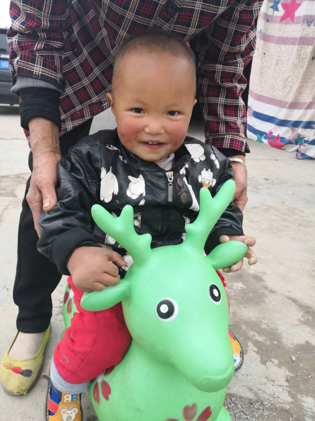 孩子收到玩具露出了開心的笑容。