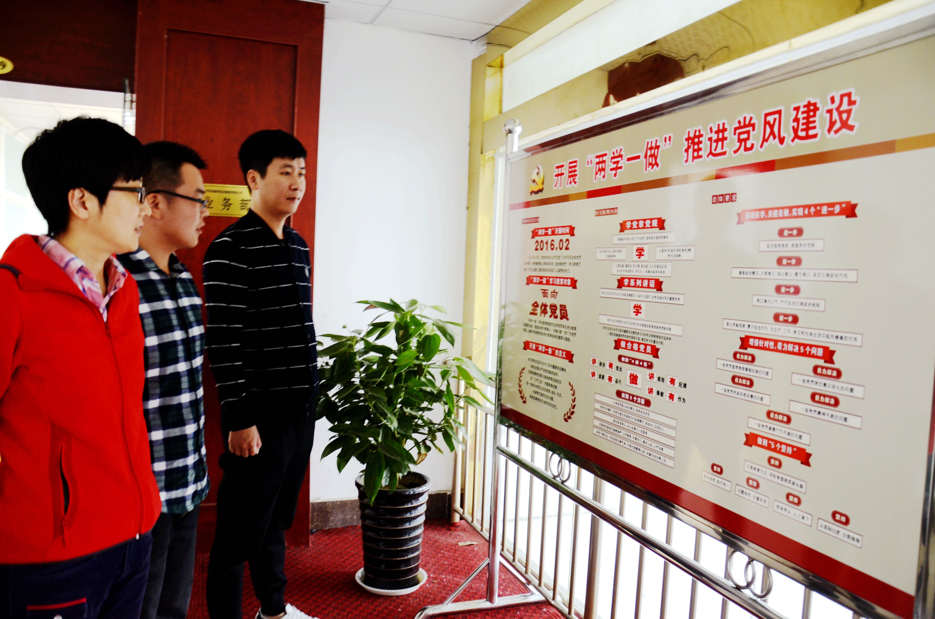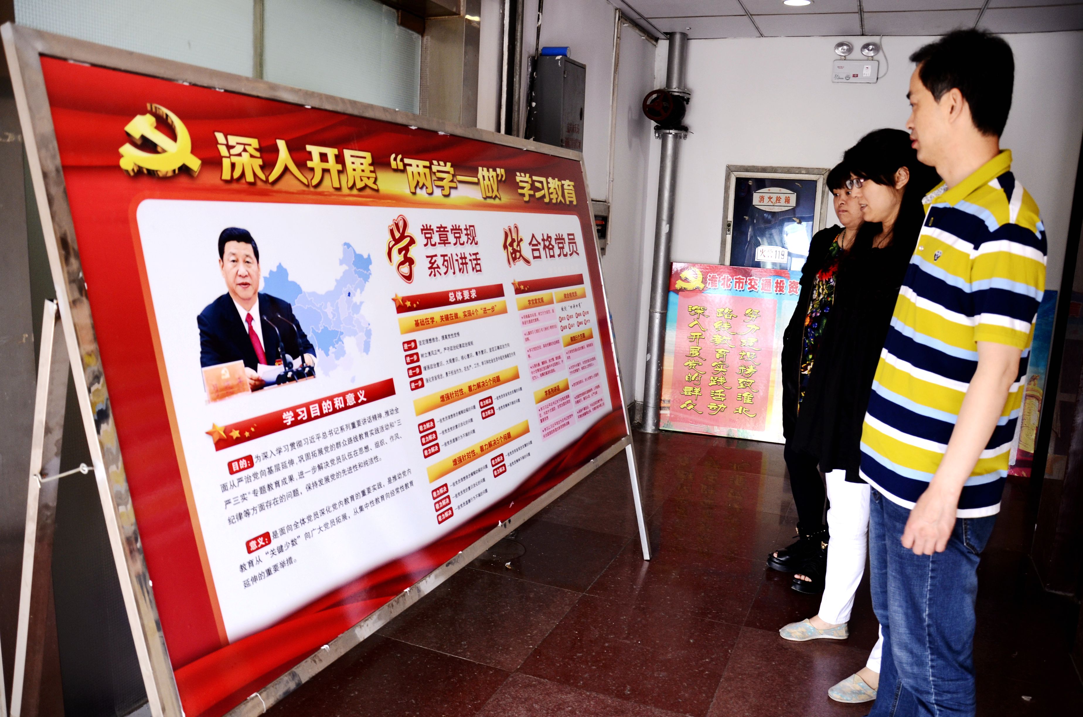 圖為同創(chuàng)集團、交投公司、保安公司的 員工在觀看 兩學(xué)一做學(xué)習(xí)教育展板。